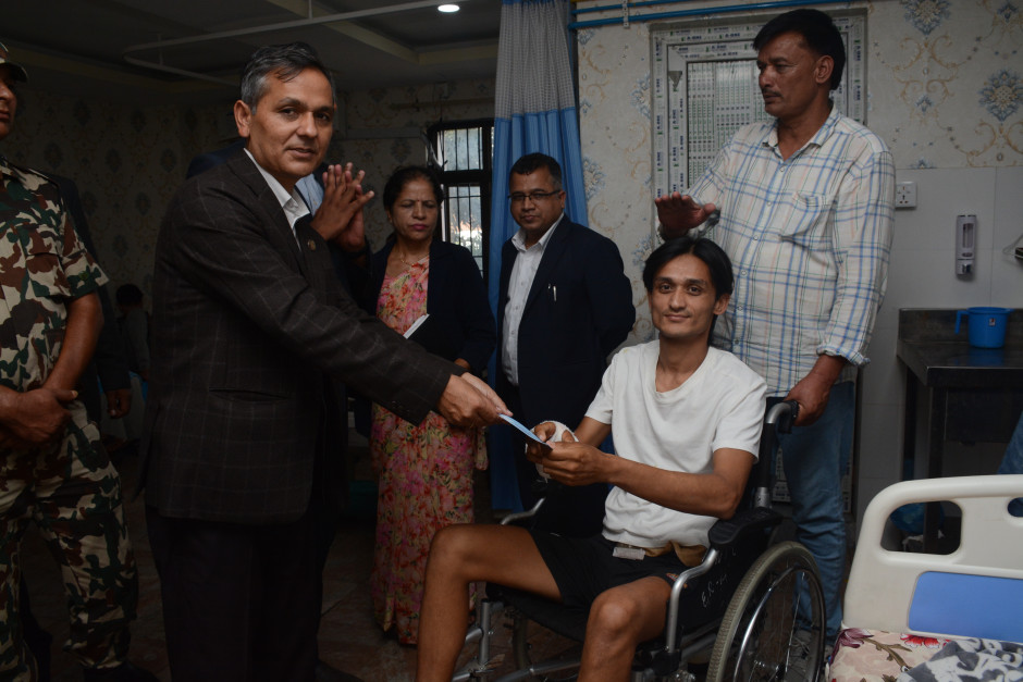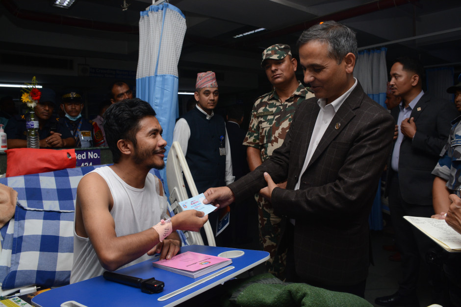 भदौ २३ र २४ गते भएका जेन-जी आन्दोलनका क्रममा घाइतॆ हुनुभएकालाई गृहमन्त्री ओमप्रकाश अर्यालद्वारा परिचय-पत्र वितरण गर्नुहुँदै।