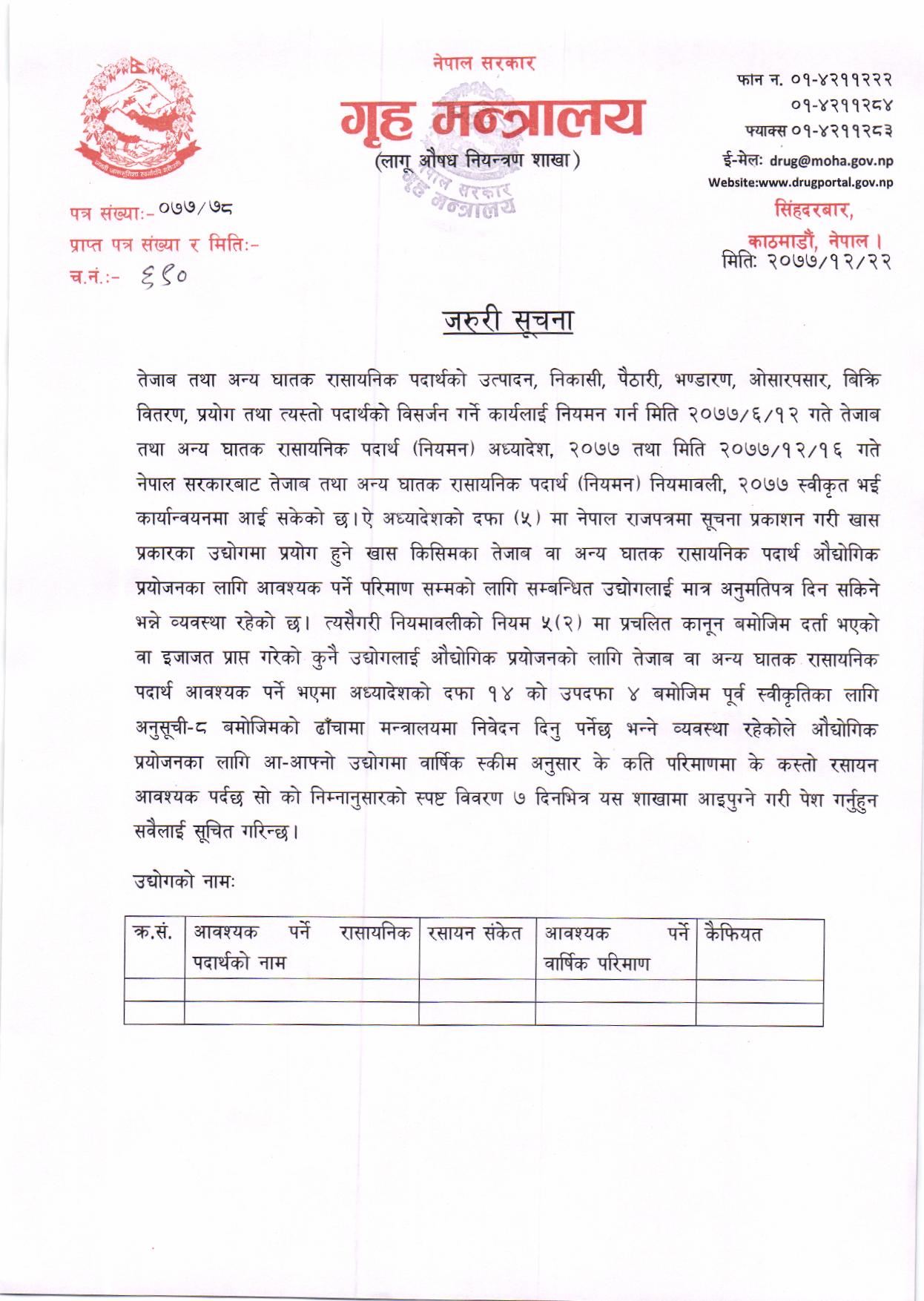 2077-12-22 तेजाब तथा अन्य घातक रासायनिक पदार्थ सम्बन्धी जरुरी सूचना