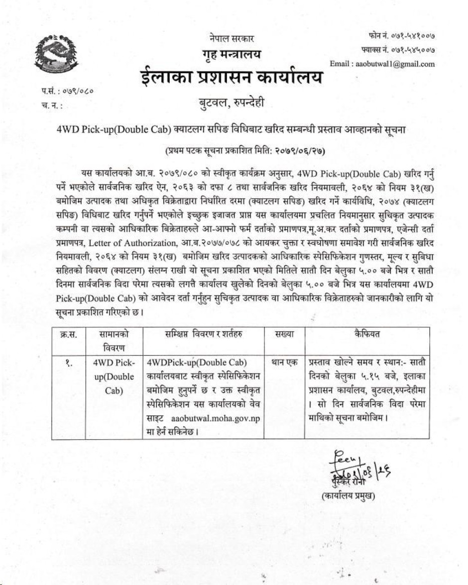 4WD Pick-up(Double Cab) क्याटलग सपिङ विधिबाट खरिद सम्बन्धी प्रस्ताव आव्हानको सूचना
