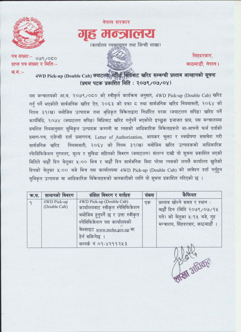 4WD Pick-up (Double Cab) क्याटलग सपिङ विधिबाट खरिद सम्बन्धी प्रस्ताव आव्हानको सूचना