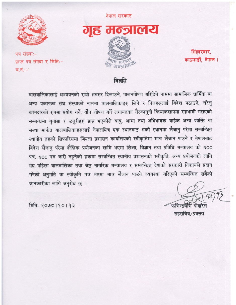 बाबु,आमा तथा अभिभावक बाहेक अन्य व्यक्ति वा संस्था मार्फत् बालबालिकाहरुलाई नेपालभित्र एक स्थानबाट अर्को स्थानमा वा नेपालबाट विदेश लैजान स्वीकृति लिनुपर्ने सम्बन्धमा