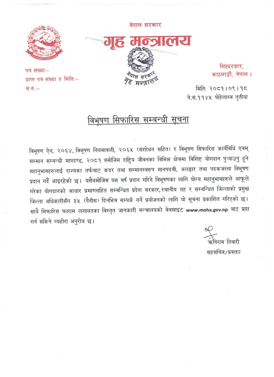 बिभुषण सिफारिस सम्बन्धि सूचना