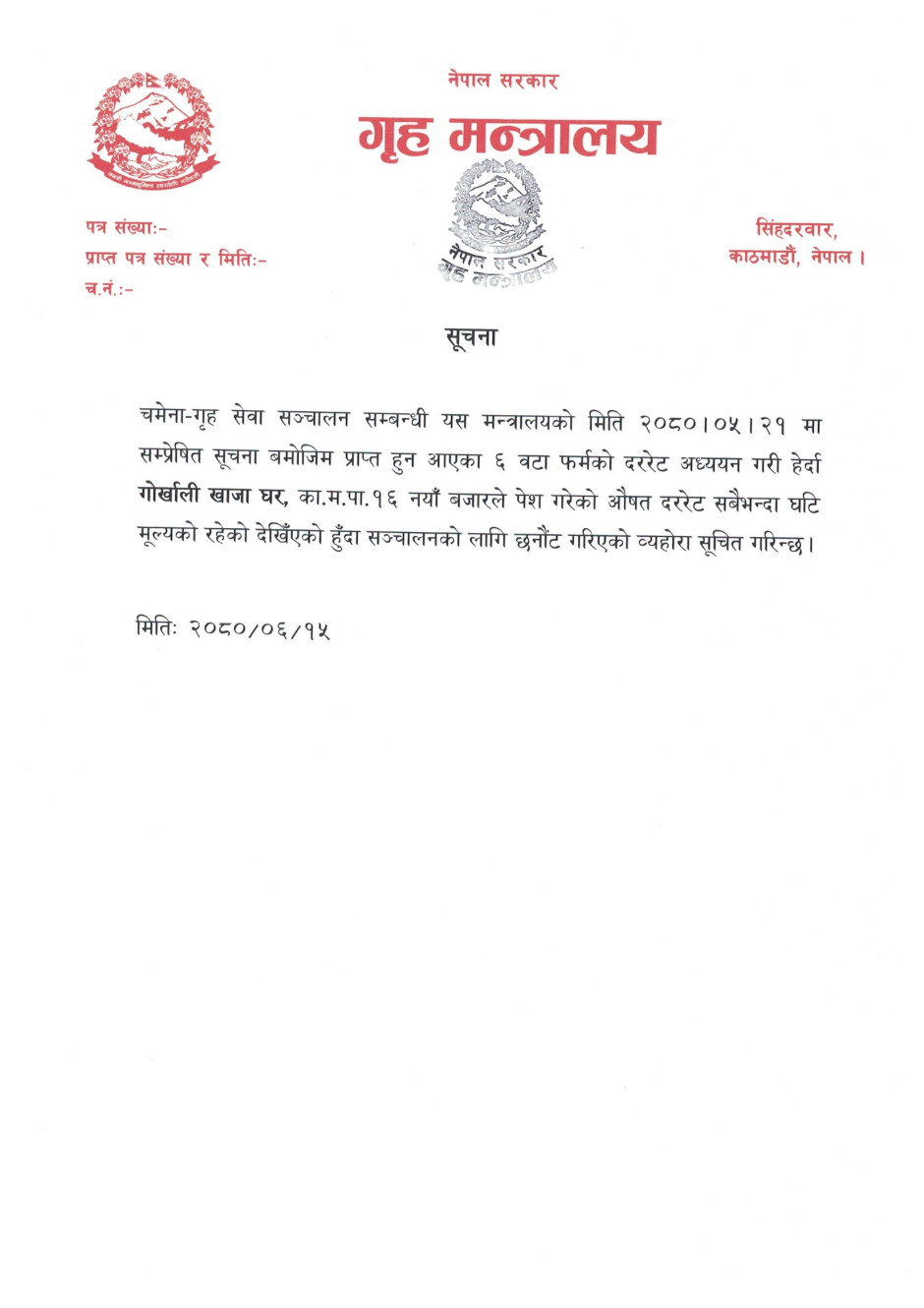 चमेना गृह सञ्चालन सम्बन्धमा ।