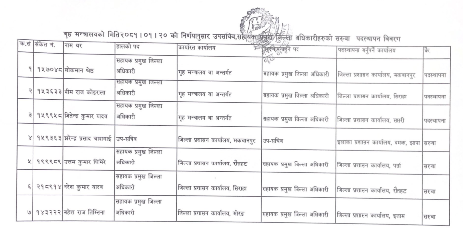 गृह मन्त्रालयको २०८१।१।२० को निर्णयानुसार उपसचिव, सहायक प्रमुख जिल्ला अधिकारीहरुको सरुवा र पदस्थापना