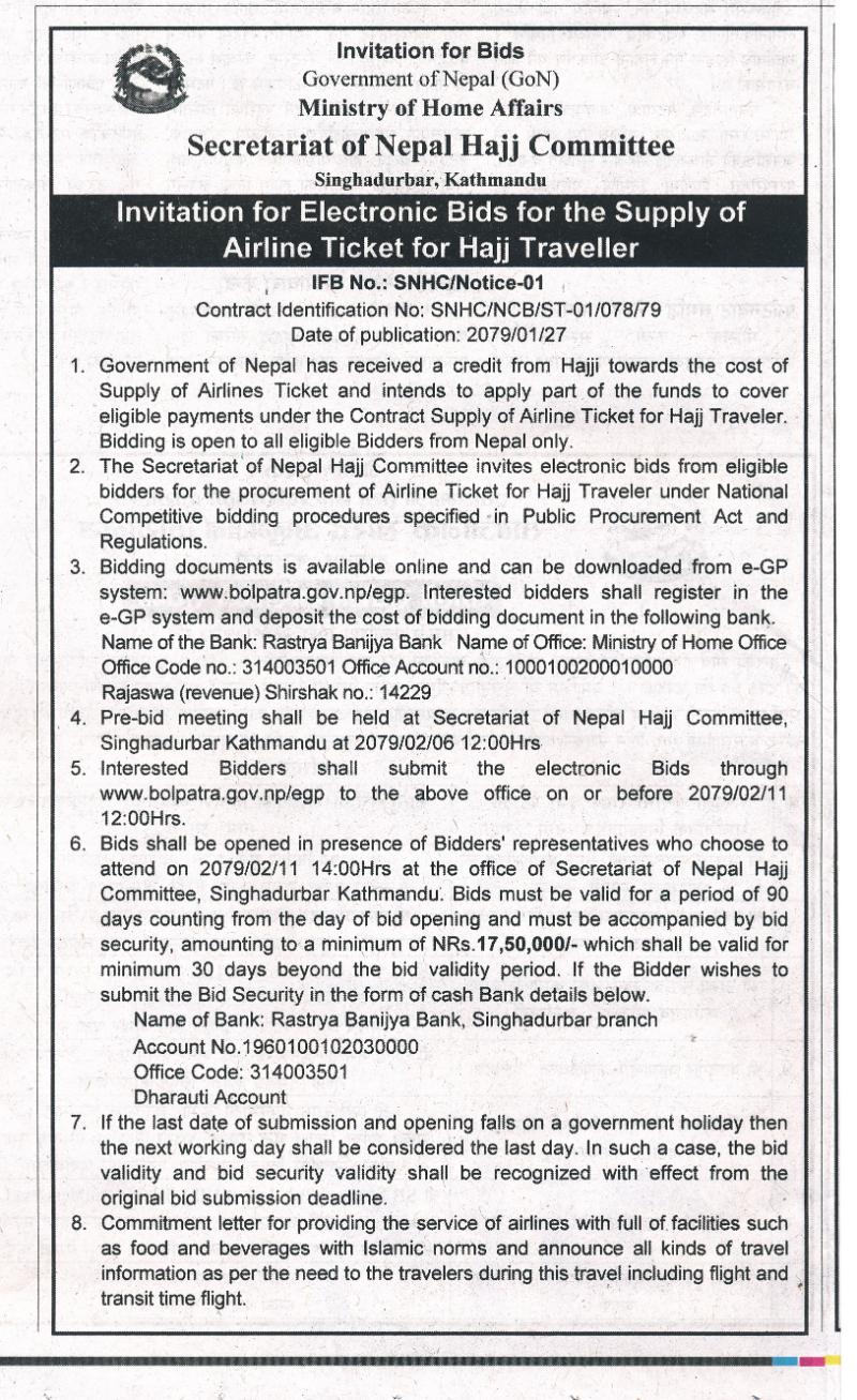 Supply of Airline Tickets for Hajj Pilgrims- 2026 खरिद सम्बन्धी बोलपत्र आव्हानको सूचना