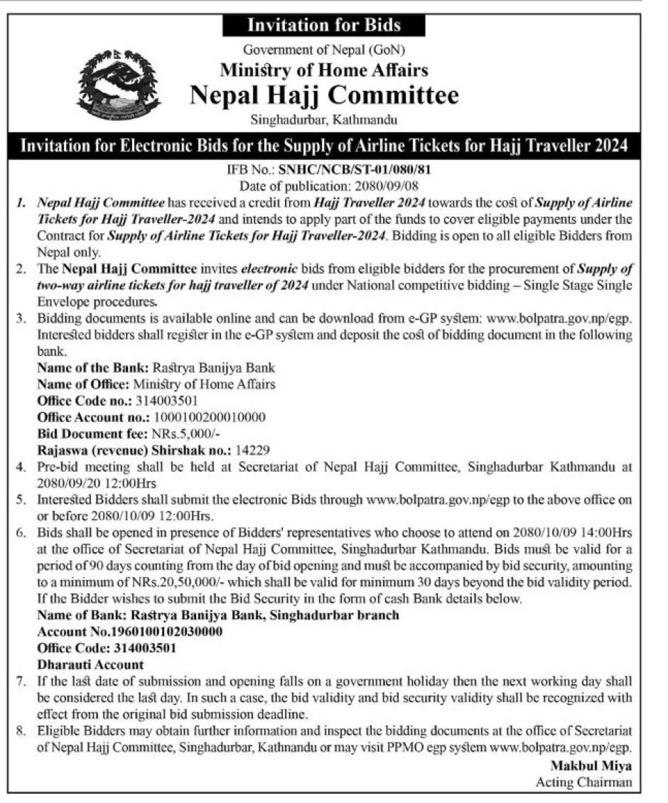 सन् २०२४ हज यात्रीहरुको हवाइ टिकट खरिद सम्बन्धी बोलपत्र आव्हानको सूचना