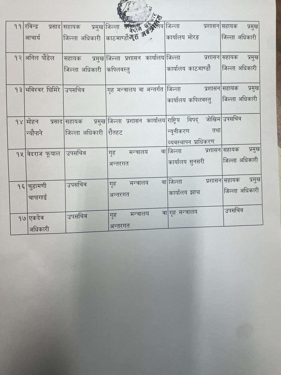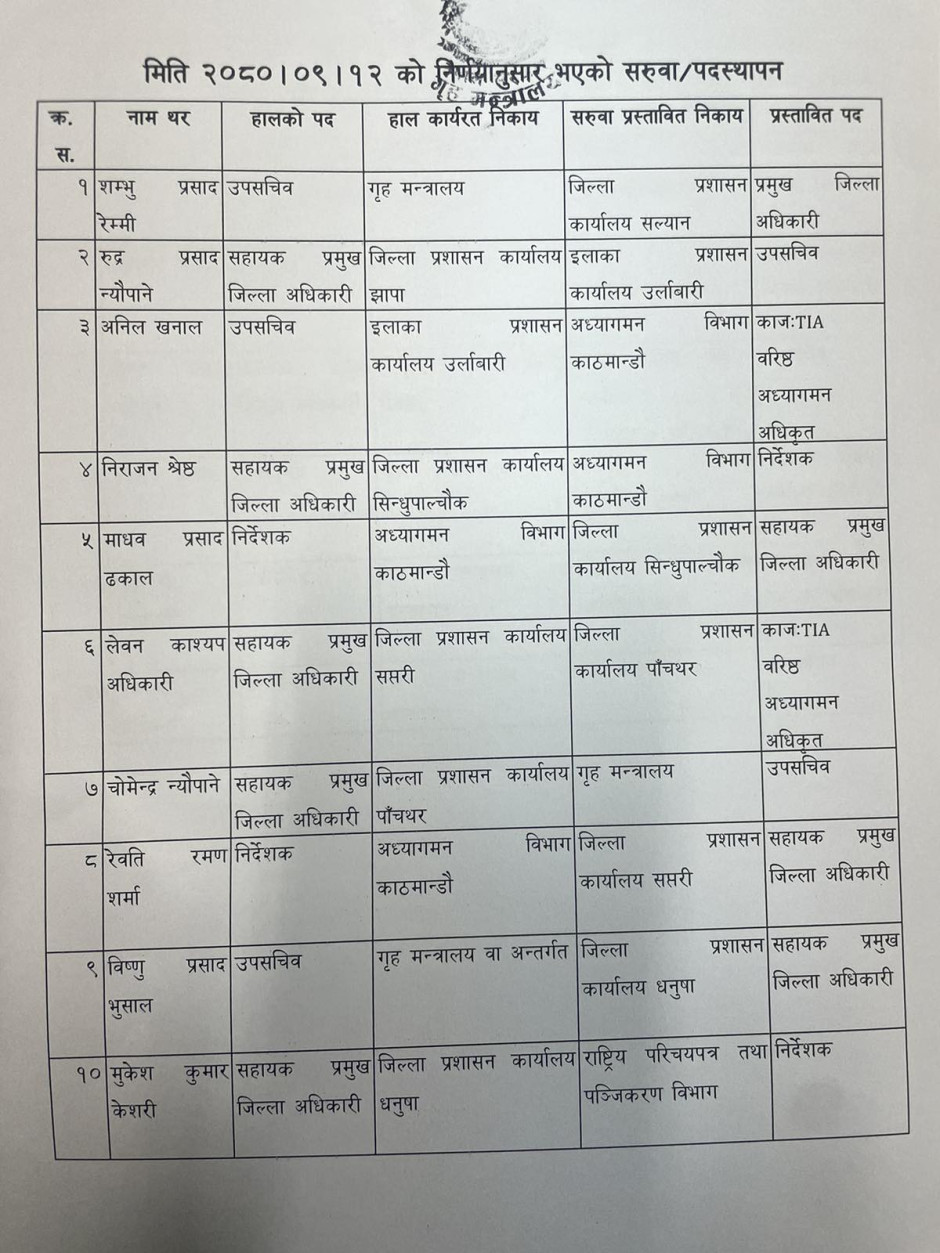 गृह मन्त्रालयको मिति २०८२।१२।२२ को निर्णयानुसार सुरुवा/पदस्थापन भएका रा.प. प्रथम र रा.प.द्वितीय श्रेणीका कर्मचारीहरूको विवरण