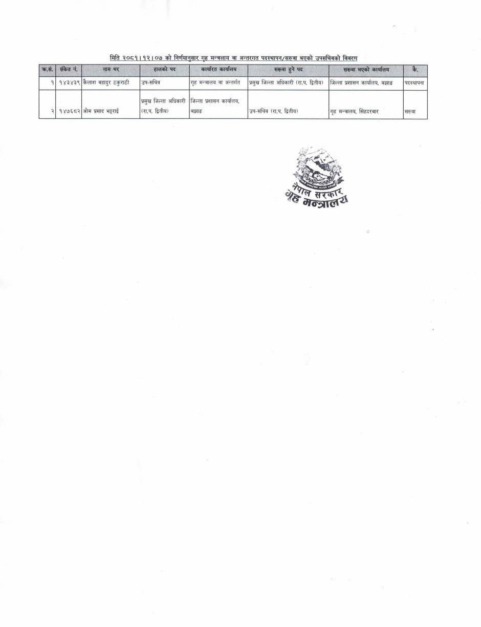 मिति २०८१।१२।०७ को निर्णयानुसार गृह मन्त्रलाय वा अन्तरगत पदस्थापन/सरुवा भएको उपसचिवको विवरण