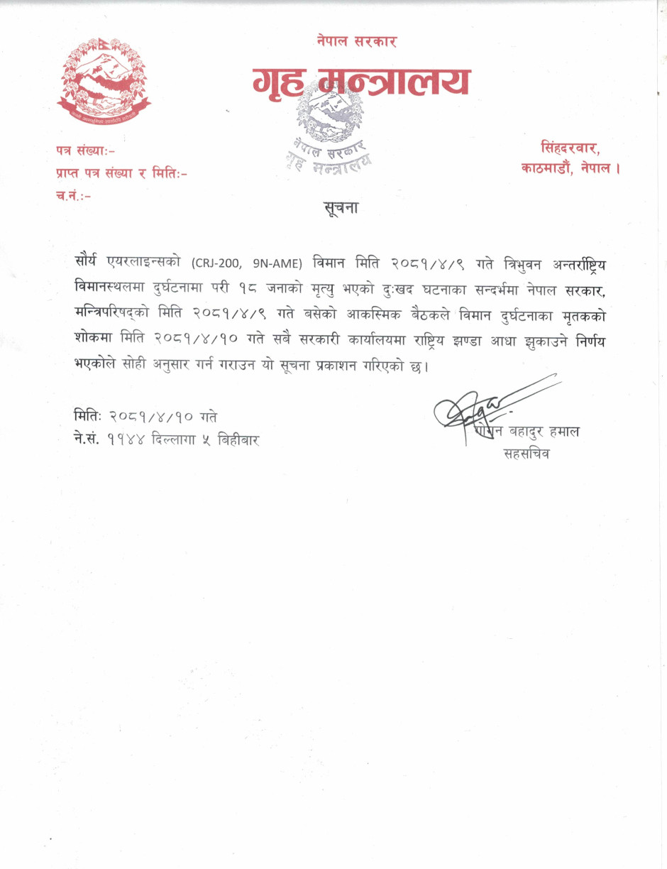 सूचना (विमान दुर्घटनाको शोकमा राष्ट्रिय झण्डा आधा झुकाउने)