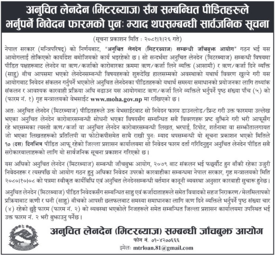 मिटरब्याज सँग सम्बन्धित पीडितहरुले भर्ने फारमको पुन: म्याद थप सम्बन्धी सूचना ।