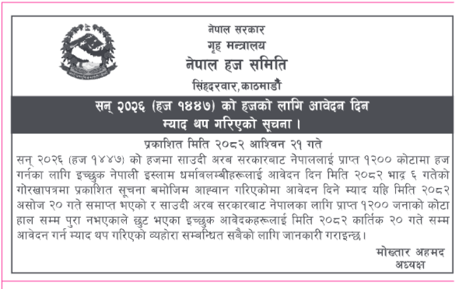 सन् २०२६ ( हज १४४७) को हजको लागि आवेदन दिन म्याद थप गरिएको सूचना