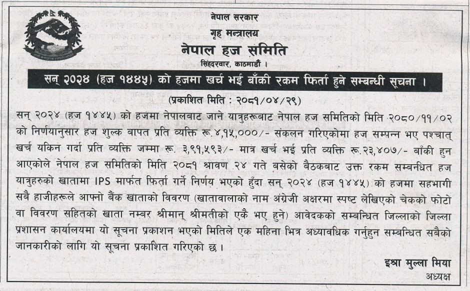 सन् २०२४ (हज १४४५) को हजमा खर्च भई बाँकी रकम फिर्ता हुने सम्बन्धी