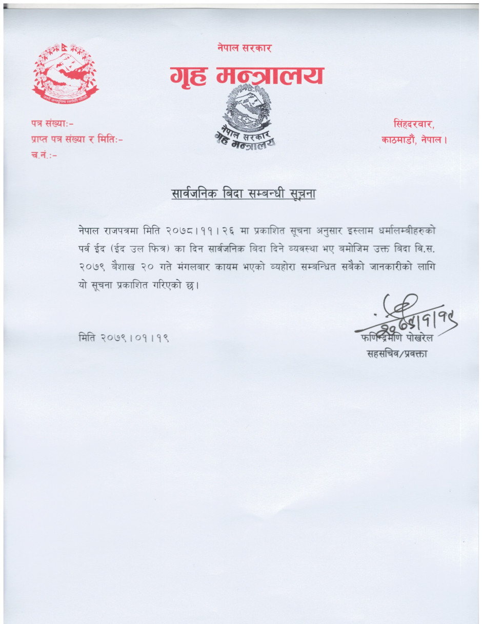 ईद उल फित्रमा सार्वजनिक विदा सम्बन्धी सूचना