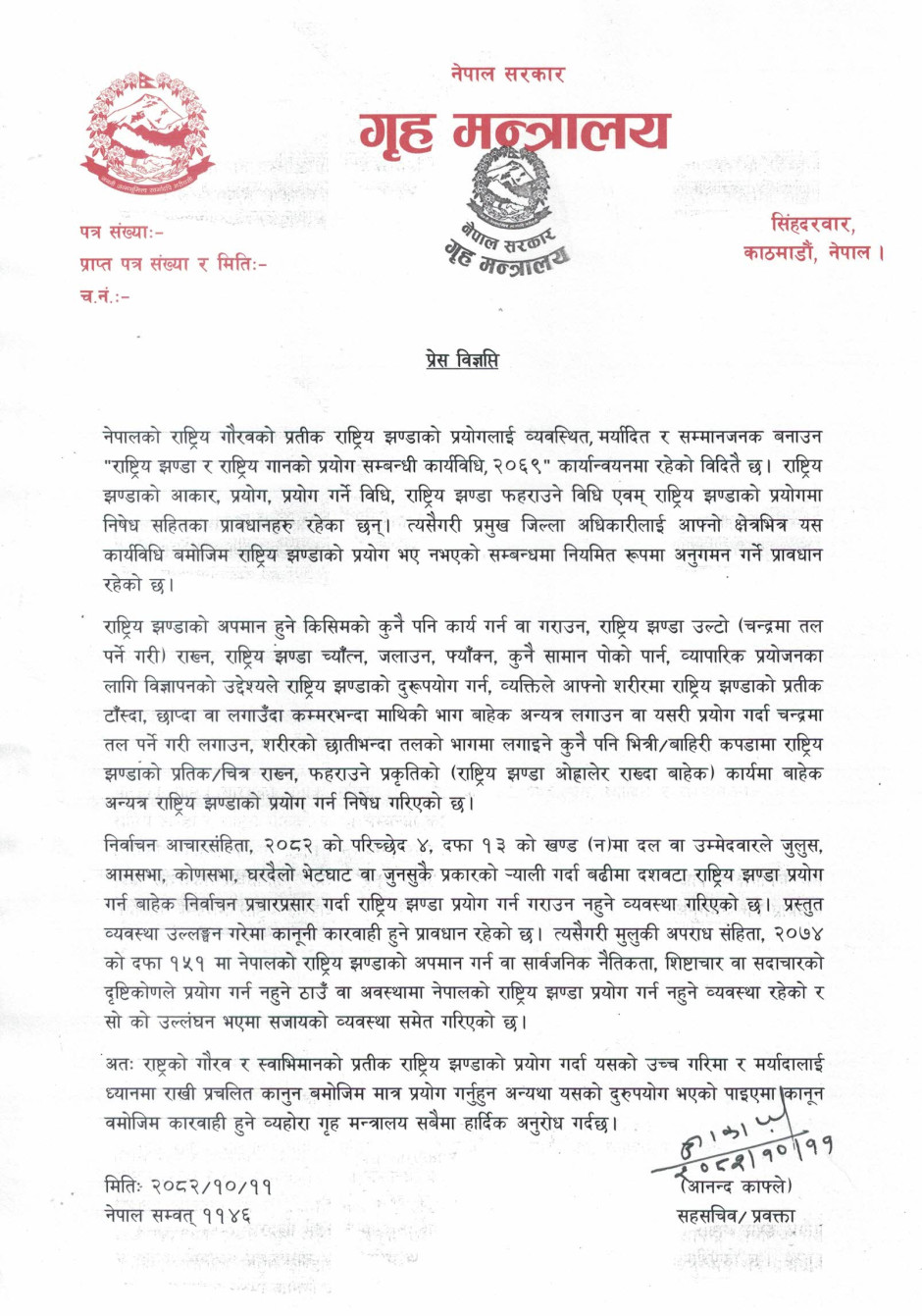 गृह मन्त्रालयसँग सम्बन्धित गुनासोका लागि सम्पर्क नम्बर