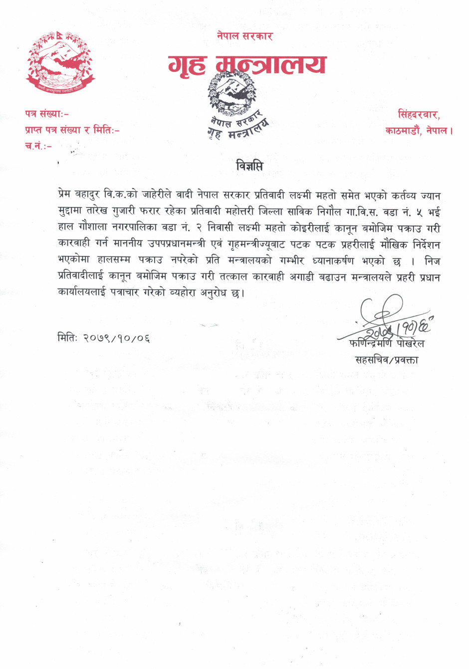 प्रतिवादी लक्ष्मी महतो कोइरीलाई कानून बमोजिम पक्राउ गरी तत्काल कारवाही बढाउने सम्बन्धमा