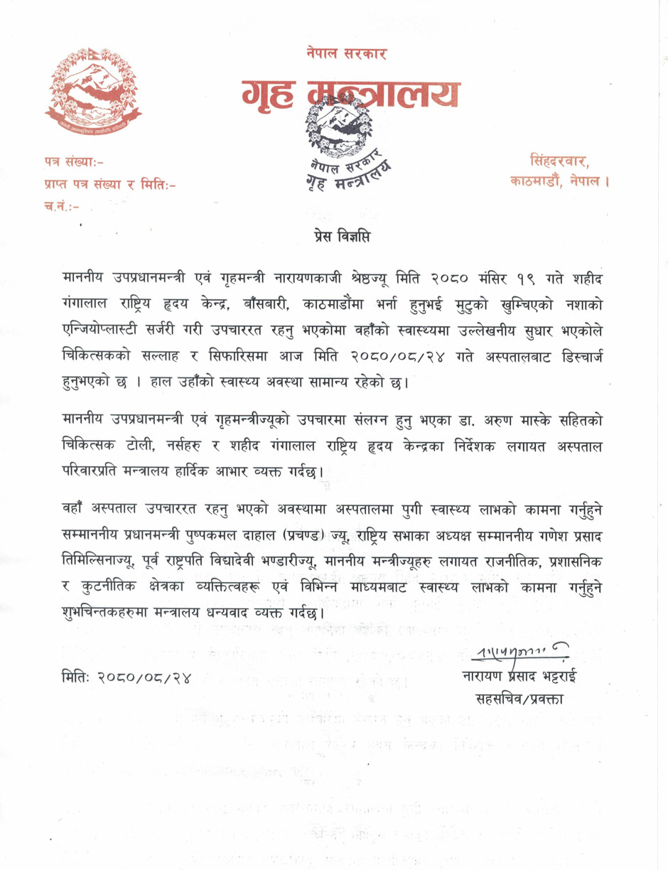 प्रेस विज्ञप्ति (माननीय उपप्रधानमन्त्री एवं गृहमन्त्री नारायणकाजी श्रेष्ठज्यूको स्वास्थ्य अवस्था) सम्बन्धी