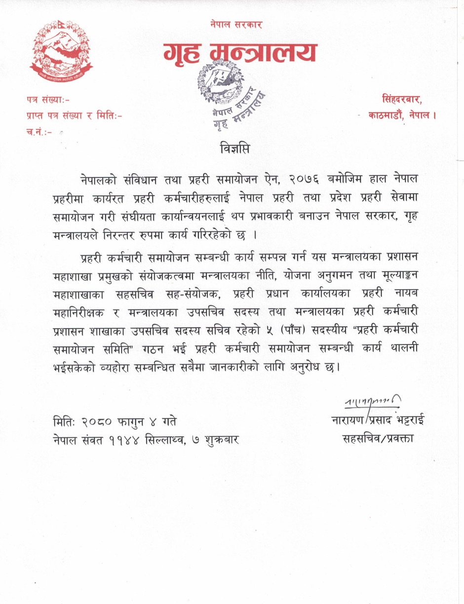 प्रेस विज्ञप्ति (प्रहरी कर्मचारी समायोजन समिति गठन सम्बन्धमा)