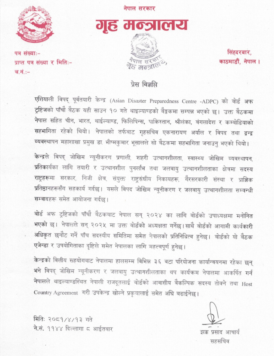 प्रेस विज्ञप्ति (एशियाली विपद पुर्वतयारी केन्द्रको बैठक सम्बन्धमा)