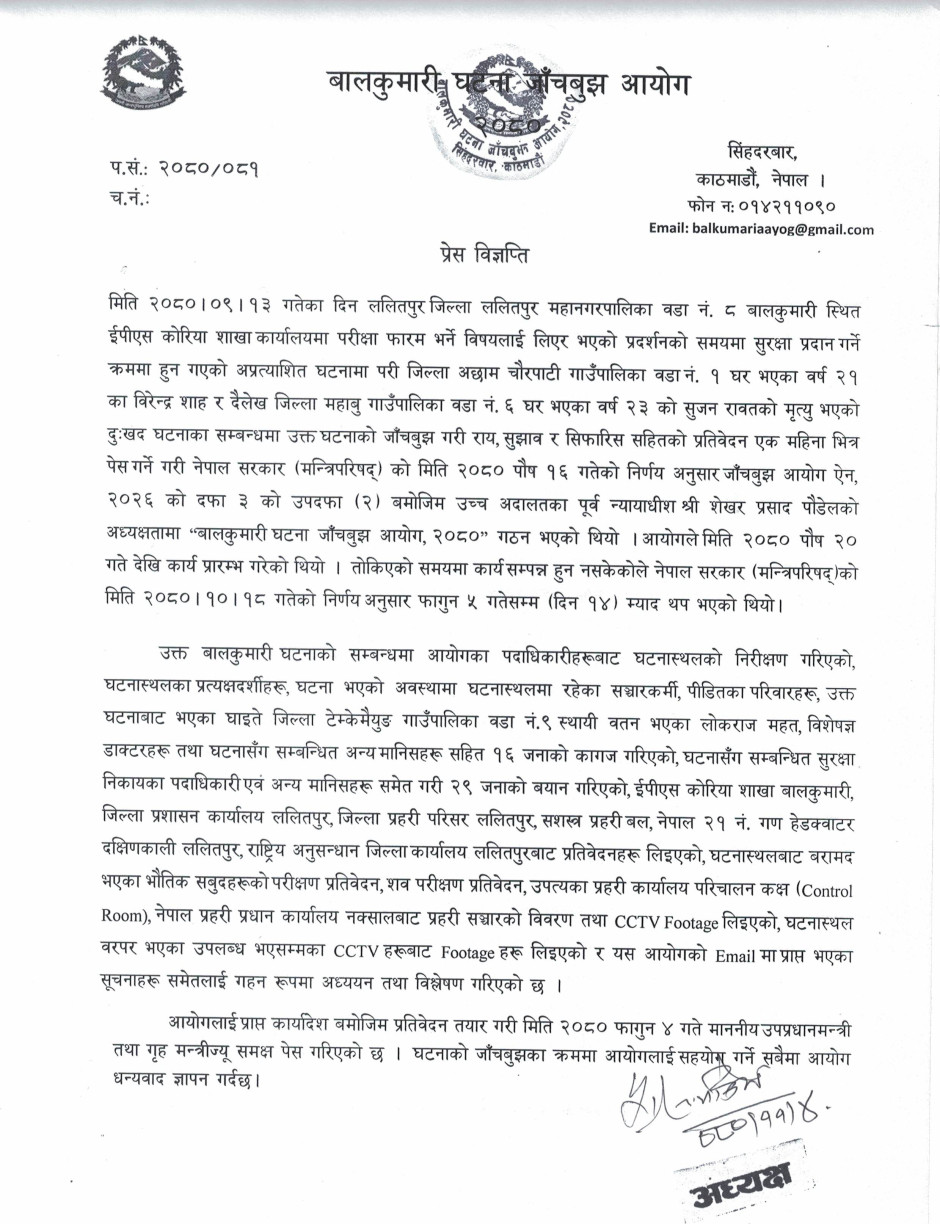 प्रेस विज्ञप्ति (बालकुमारी घटना जाँचबुझ आयोग, २०८० ले प्रतिवेदन बुझाएको सम्बन्धी)