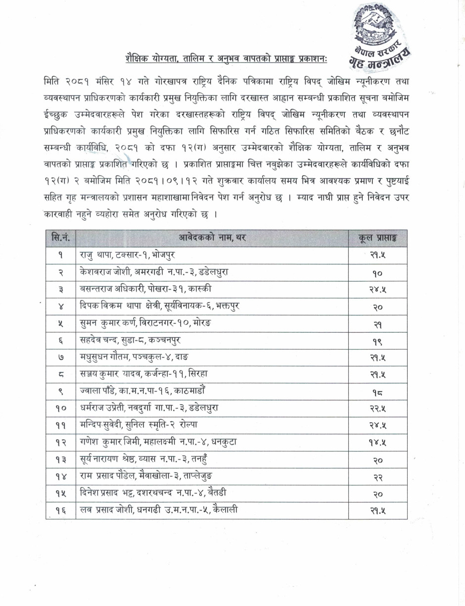 शैक्षिक योग्यता, तालिम र अनुभव वापतको प्राप्ताङ्क प्रकाशनः