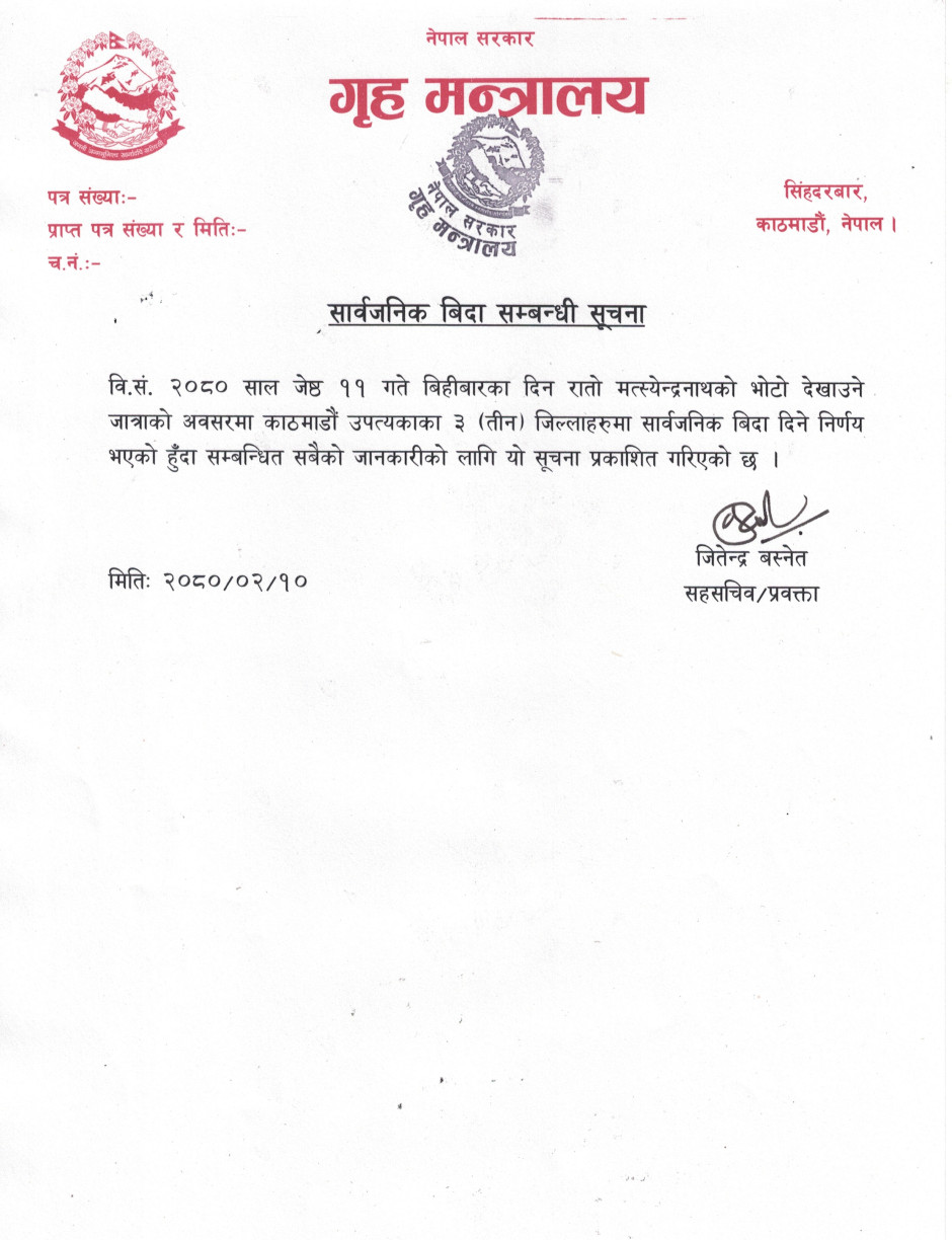 सार्वजनिक बिदा सम्बन्धी सूचना (मत्स्येन्द्रनाथको भोटो देखाउने जात्राको अवसरमा )