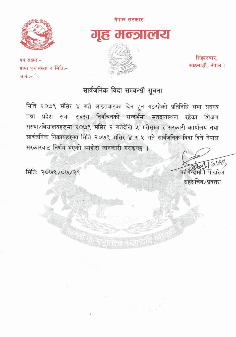 सार्वजनिक विदा सम्बन्धी सूचना