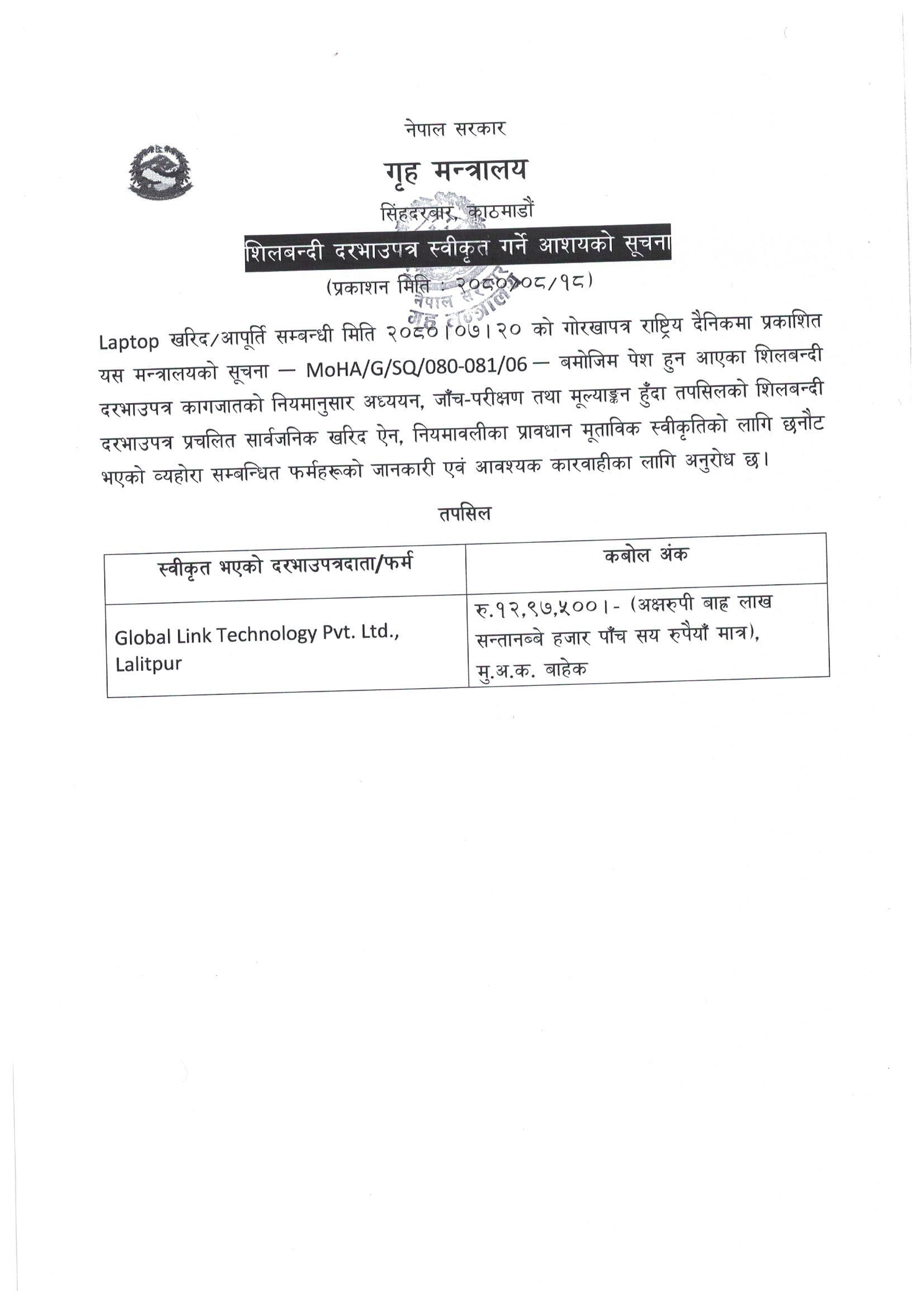 शिलबन्दी दरभाउपत्र स्वीकृत गर्ने आशयको सूचना