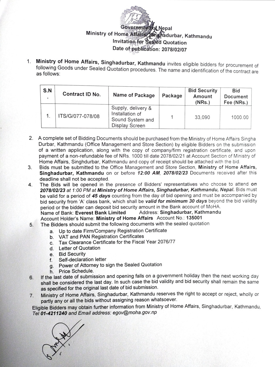 तस्बिर : Sound System र Display Screen सम्बन्धी शिलबन्दी दरभाउपत्र आव्हानको सुचना।